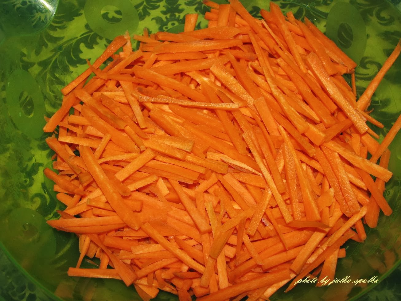 Далее для моркови есть 2 способа- нарезать тонкой соломкой ( так правильней и чем тоньше) или натереть на терке для корейской морковки.